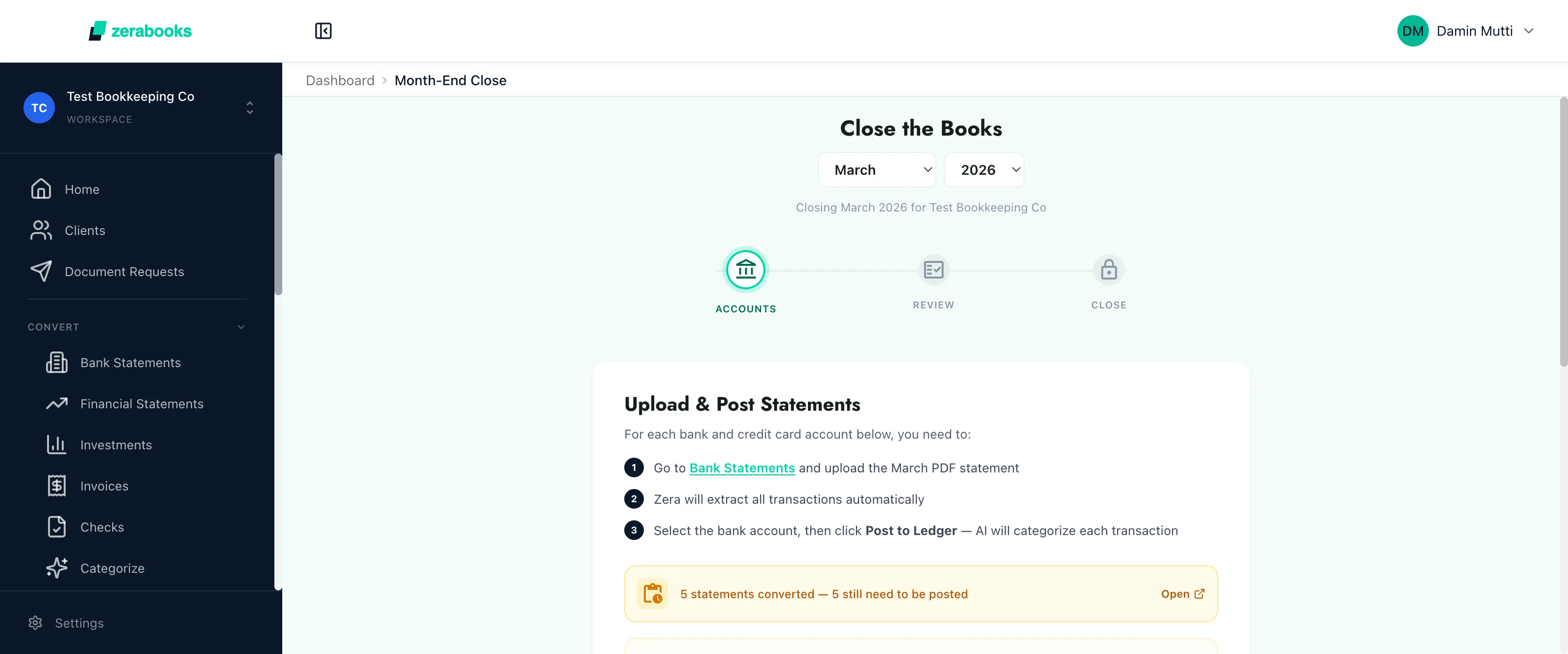 Bank reconciliation flows directly into Zera's month-end close workflow. Each reconciled bank account shows up as a close checkpoint. When all accounts are reconciled, close the period with one click.