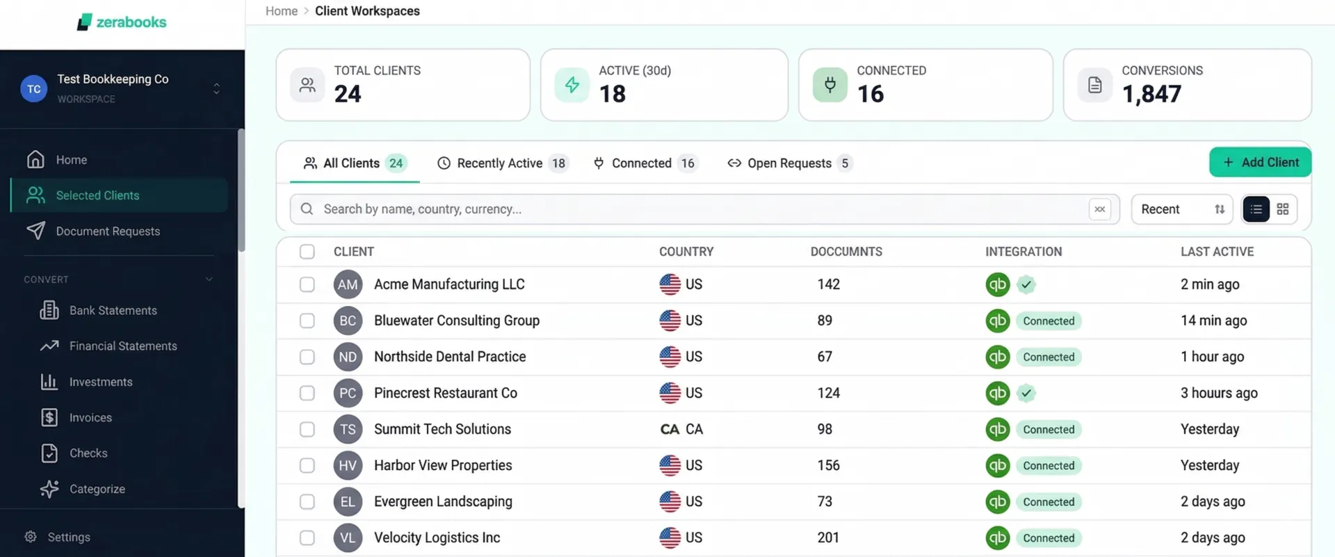 Isolated books per client. Its own chart of accounts, bank feeds, and reports. Free to add, free to switch, free to archive.